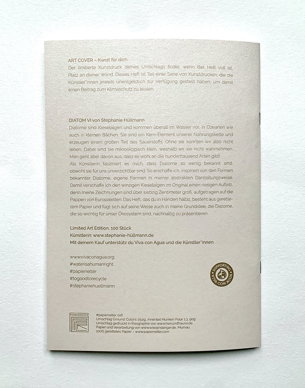 Damit verschaffe ich den winzigen Kieselalgen im Original einen riesigen Auftritt, denn meine Zeichnungen sind über siebzig Zentimeter groß, aufgetragen auf die Pappen von Europaletten. Das Heft, das du in Händen hältst, besteht aus gerettetem