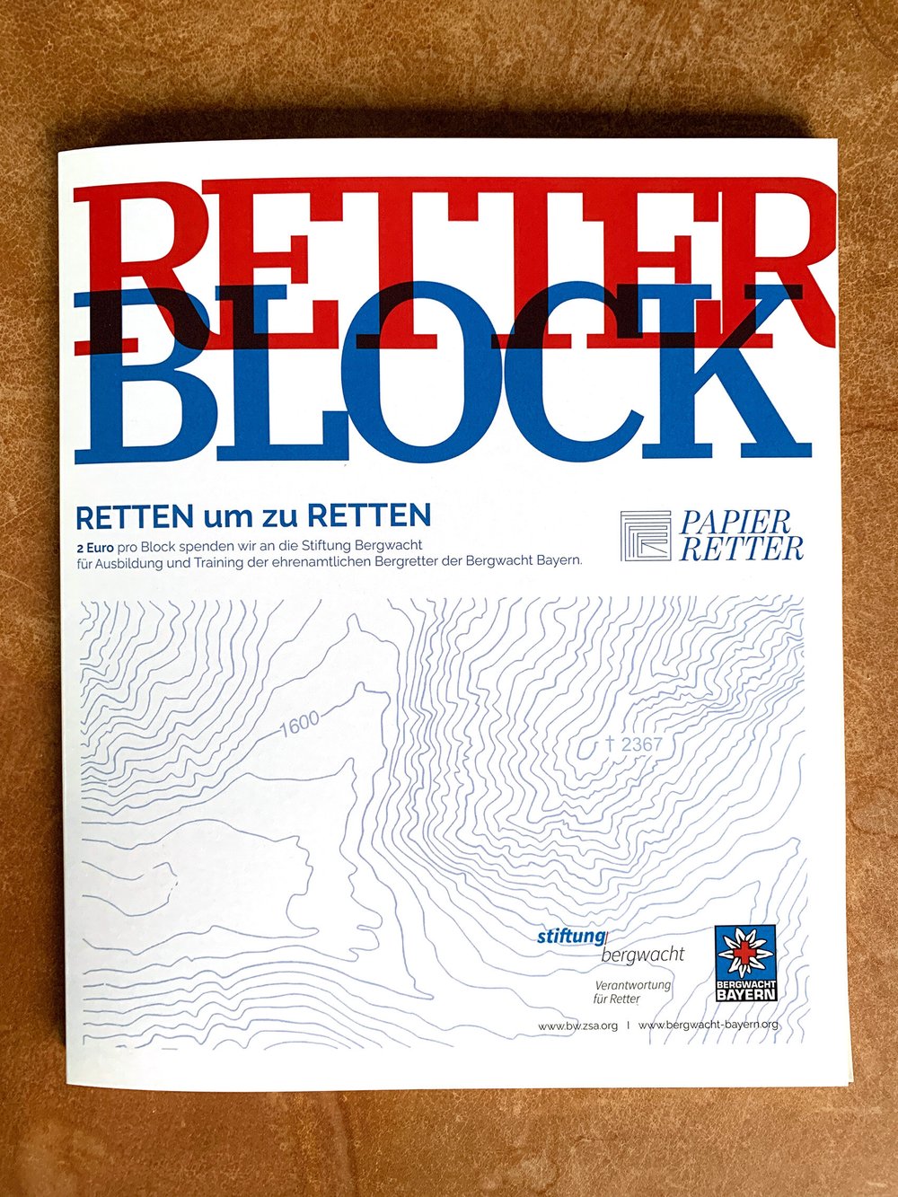 Was macht man mit einer Fehlproduktion karierter Blätter?Einen Block für einen guten Zweck! Zusammen mit der Druckerei Stindl haben wir den Retter-Block aus einem reklamierten Druckauftrag konzipiert. Der Druckerei liegt die Bergwacht am Herzen und so haben wir über unseren Partner, das Alpenfilmfestival, Kontakt zur Bergwacht aufgenommen und unsere Idee präsentiert. Das Ergebnis lässt sich sehen!Für jeden verkauften Block spenden wir zwei Euro an die Stiftung Bergwacht.Design & Konzept PapierretterDruck & Verarbeitung Stindl Druck & VerlagFormat 210 x 248 mmUmschlag Digitaldruck 4c mit 300g Lakepaper Extra von Gmund PapierInnenteil 90g Designoffset, kariert